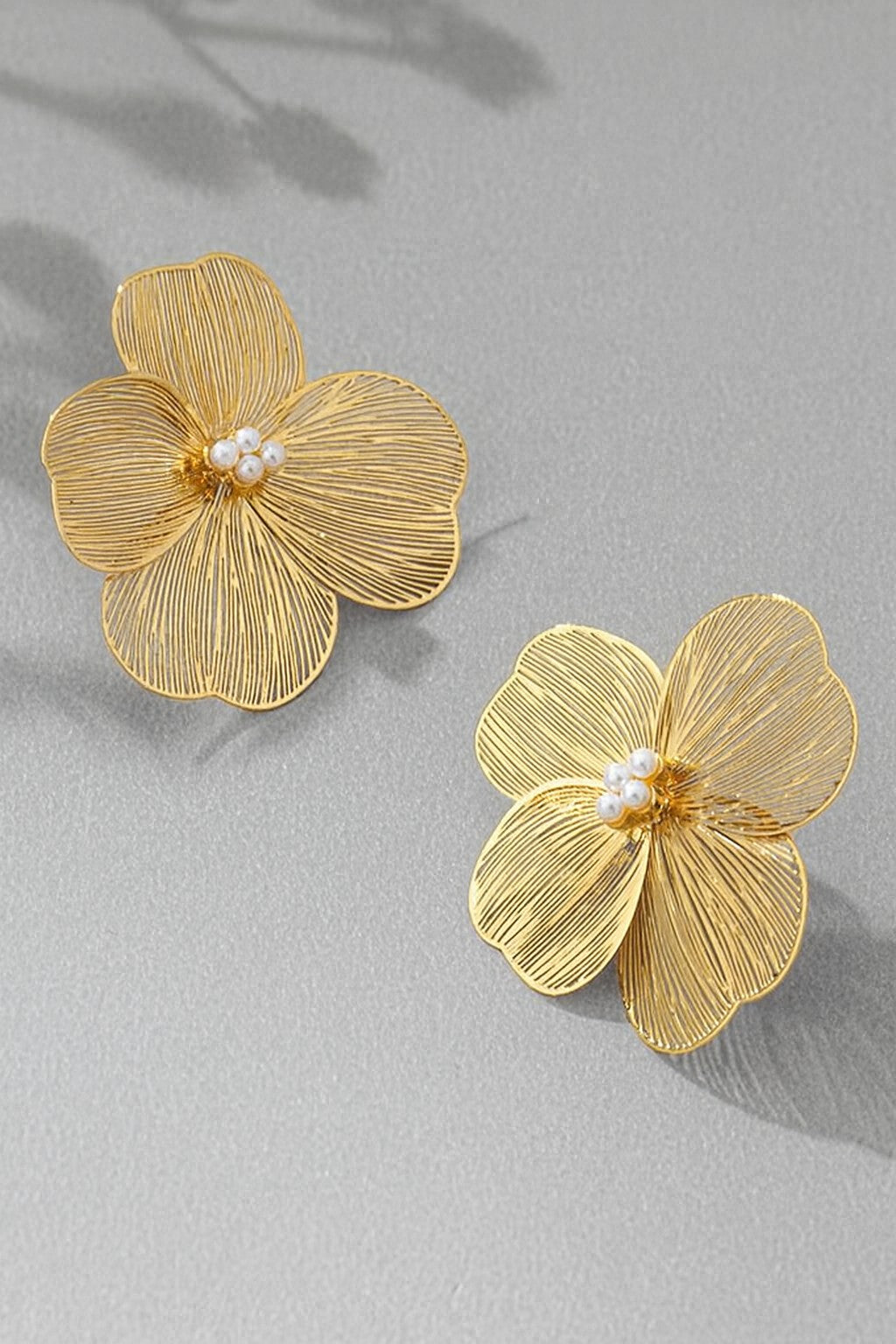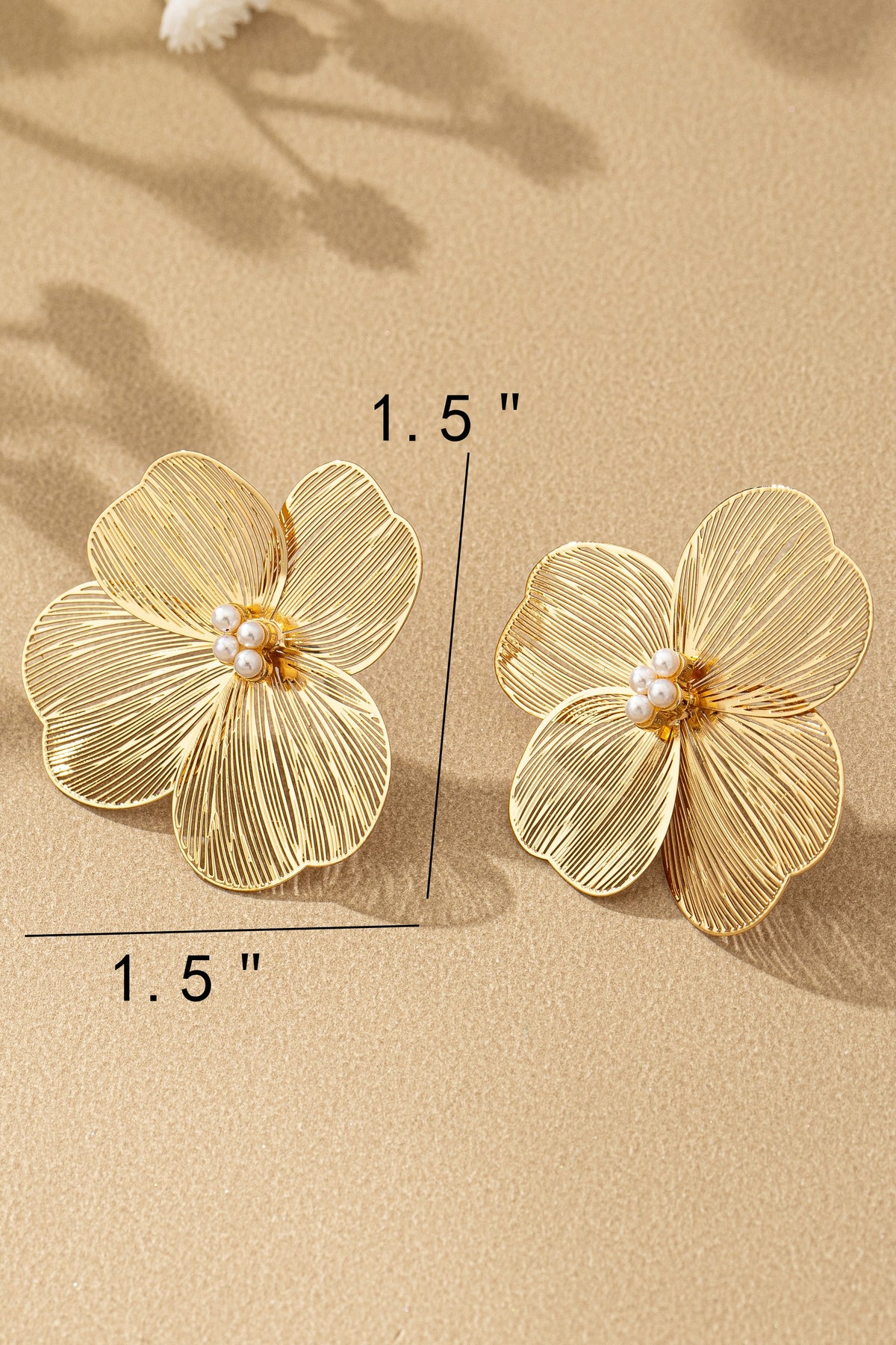 Styling tip: Pair with swept-back hairstyles and minimal accessories to let the earring's intricate floral design be the focal point. These statement earrings are perfect for weddings, garden parties, brunch, or any occasion where you want to add botanical elegance. The five stamped filigree petals create beautiful texture and dimension, while the cluster of small pearls at the center adds a touch of classic sophistication. Despite their bold 1.5" size, these earrings are surprisingly lightweight and comfortable for all-day wear. Perfect for brides, bridesmaids, or anyone who loves floral-inspired jewelry. Pair with an updo or swept-back hair to showcase the intricate petal detailing, and keep other accessories minimal to let these beauties shine. The shiny gold plating adds warmth and luxury. A stunning statement piece that brings garden-inspired glamour to any look!