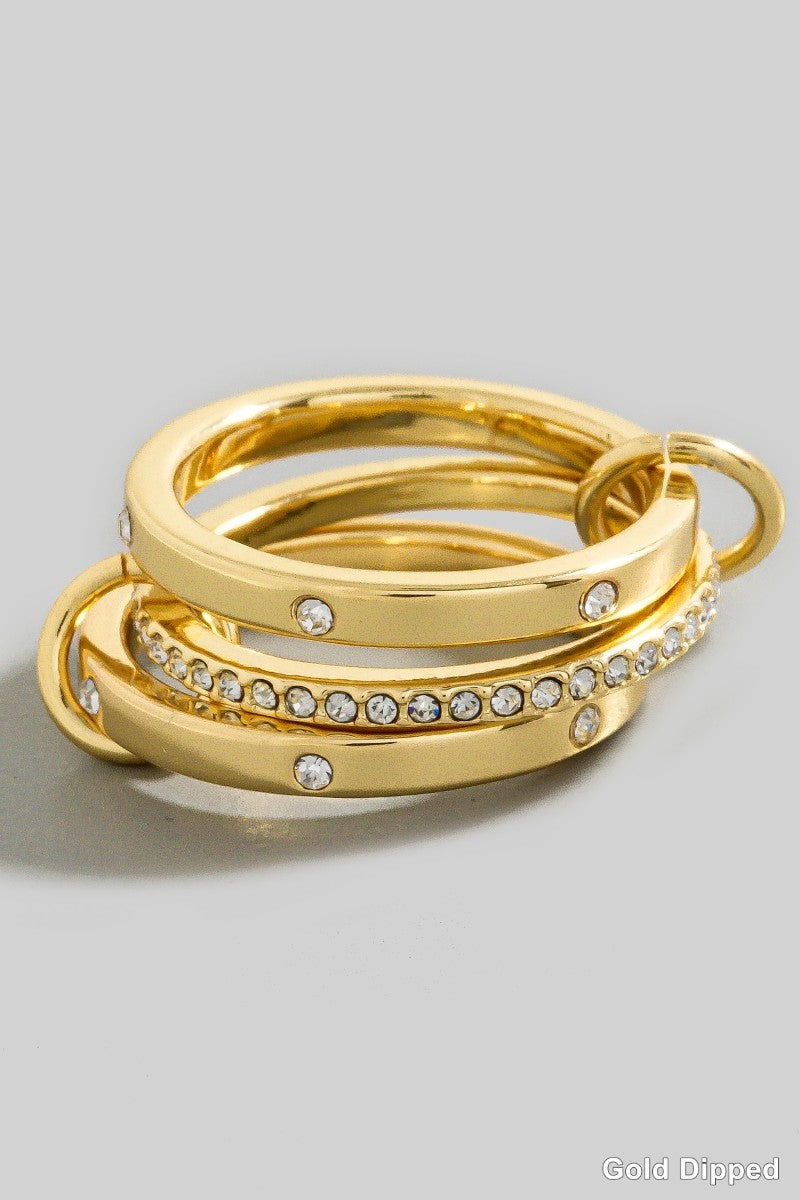 Make a statement with the Gold Dipped Linked Ring Set, a chic trio of interlocking band rings that sparkle from every angle. Designed with a mix of smooth gold bands and rhinestone-studded accents, this set brings the perfect balance of elegance and edge. Whether worn stacked together or separately, it’s the ultimate versatile accessory for any outfit.