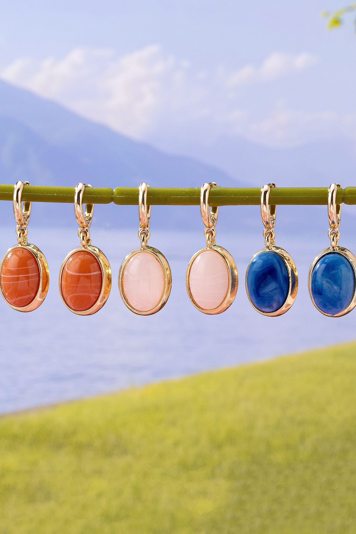 Luminous and eye-catching, the Oval Stone Drop Earrings bring classic elegance with modern sparkle. These stunning earrings feature polished oval-cut stones that sway gracefully from sleek gold-tone hoops, creating beautiful movement with every turn. Available in gorgeous colors including coral, blush pink, and deep blue. Lightweight and comfortable for all-day wear.