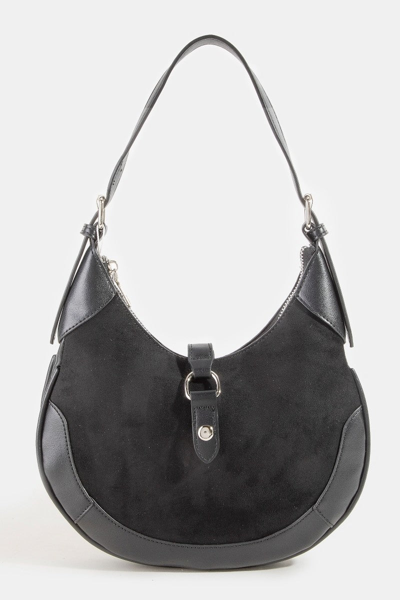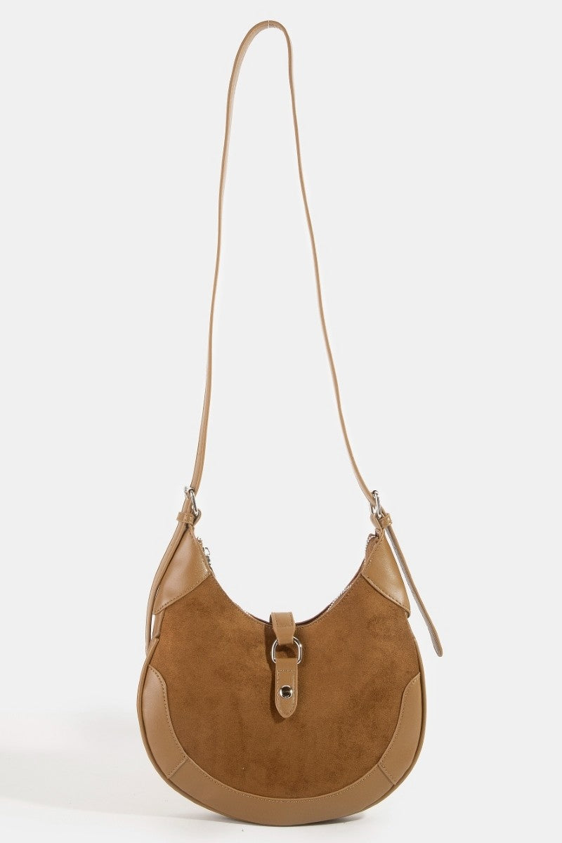 Elevate your everyday look with this chic Leather Accent Suede Crescent Handbag, designed to blend timeless elegance with modern versatility. Featuring a soft suede body complemented by sleek faux-leather accents, this crescent-shaped bag brings a touch of refined sophistication to any outfit.