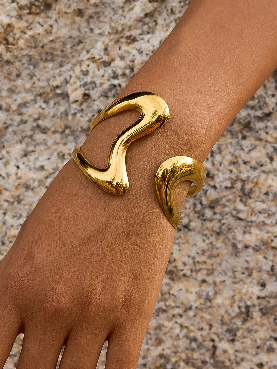 Make a bold artistic statement with our Sculptural Abstract Cuff Bracelet โ€“ a stunning piece that blurs the line between jewelry and wearable art. This eye-catching cuff features fluid, organic curves that create a modern, sculptural silhouette on your wrist.