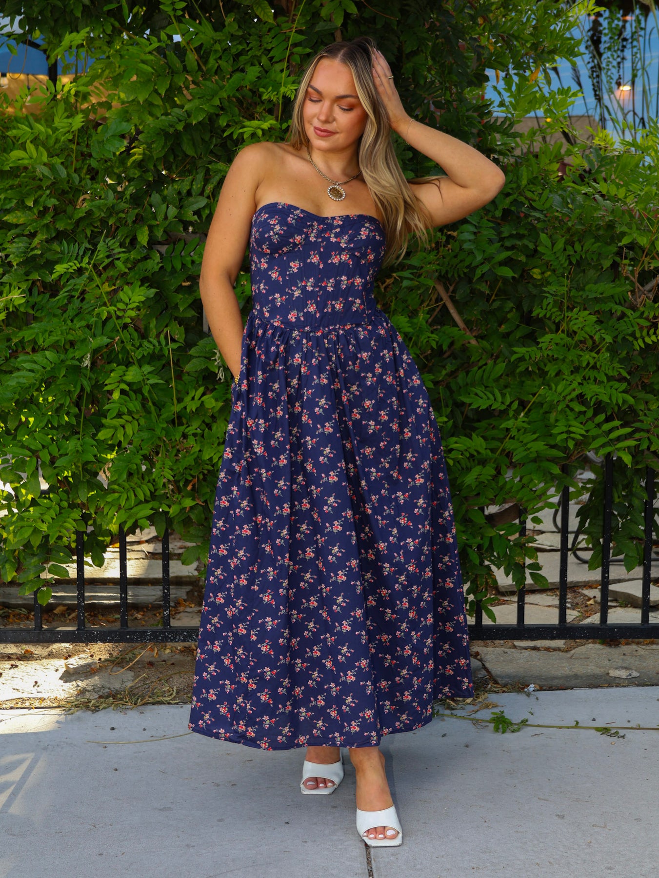 The strapless sweetheart neckline and smocked back ensure a flattering yet flexible fit, while the flowing full-length skirt creates graceful movement with every step. Designed with practical side seam pockets and a delicate allover floral print, it’s the perfect balance of beauty and function.