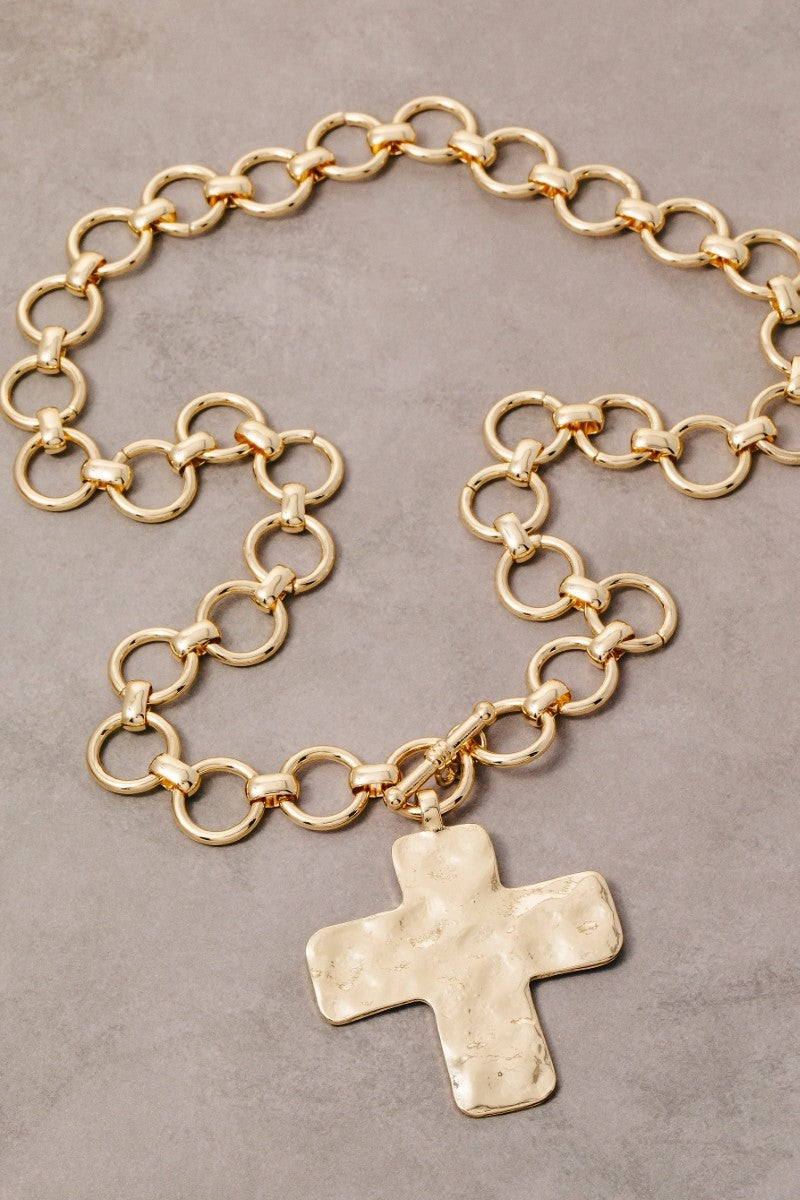 Elevate any outfit with this bold and beautifully crafted Hammered Cross Pendant Toggle Necklace. Designed with oversized interlocking chain links and a textured flat cross pendant, this statement piece blends modern edge with timeless elegance. The front toggle closure adds a trendy, high-end touch while making it easy to wear.
