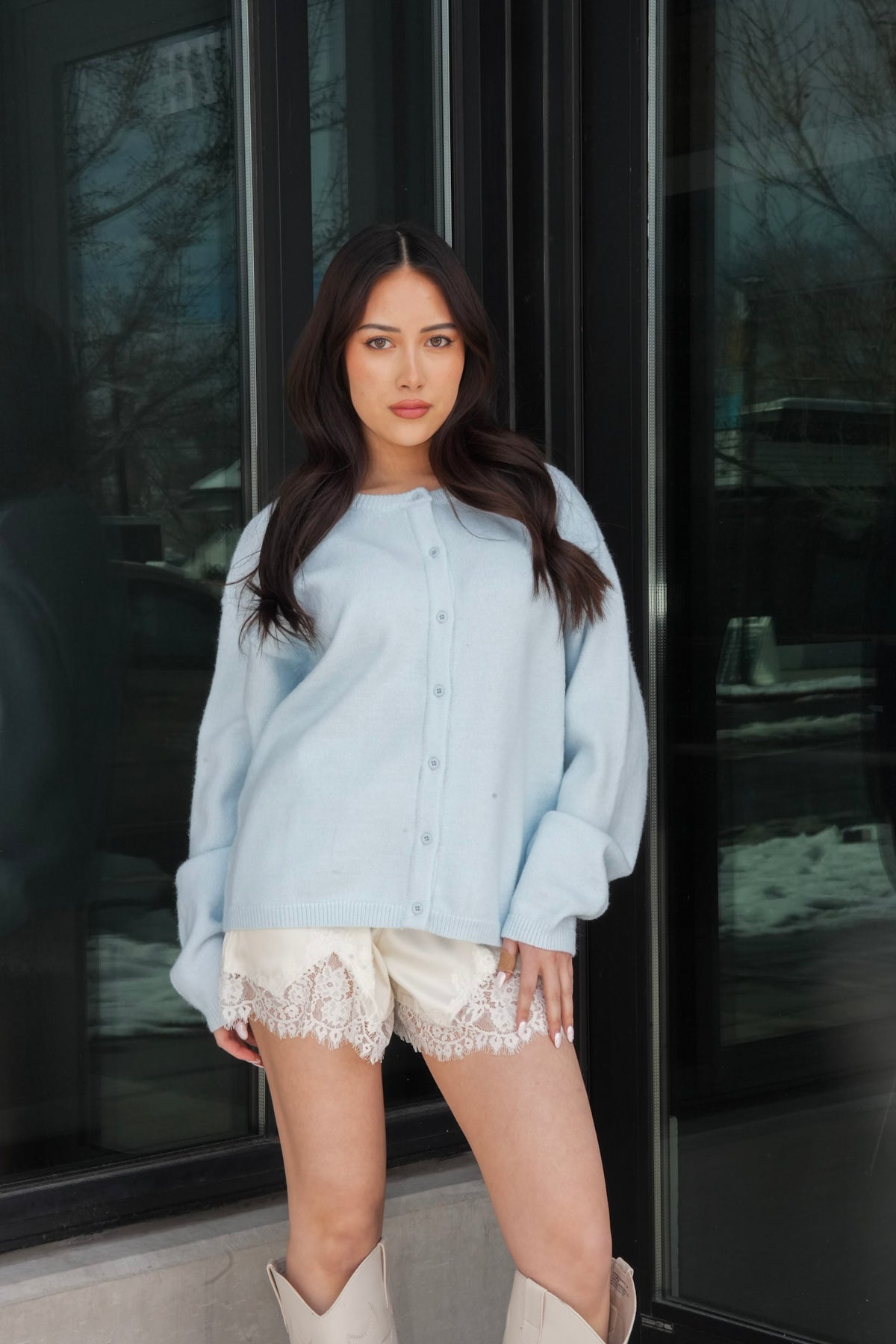 The Marley Lightweight Oversized Cardigan is your new favorite layering piece for effortless, cozy-chic style! The oversized silhouette creates a relaxed, comfortable fit that's perfect for throwing on over tanks, tees, or dresses. The lightweight knit fabric blend is soft and breathable, making this cardigan ideal for year-round wear—cozy enough for cooler days but light enough for warmer weather. The classic button front gives you endless styling options: wear it buttoned up for a polished look, leave it open for casual layering, or button just a few for an effortlessly cool vibe. The long sleeves keep things cute and relaxed, while the ribbed trim at the cuffs and hem adds structure and polish. The soft baby blue color is dreamy and versatile, pairing beautifully with everything from denim to dresses. Perfect for work, weekend, brunch, travel, or everyday wear. Pair with high-waisted jeans and a tank for casual chic, layer over a slip dress for feminine elegance, or style with leggings and sneakers for cozy comfort. The hip length is incredibly flattering and pairs perfectly with any bottom. A must-have essential that brings cozy-chic vibes, effortless style, and all-day comfort to your wardrobe!