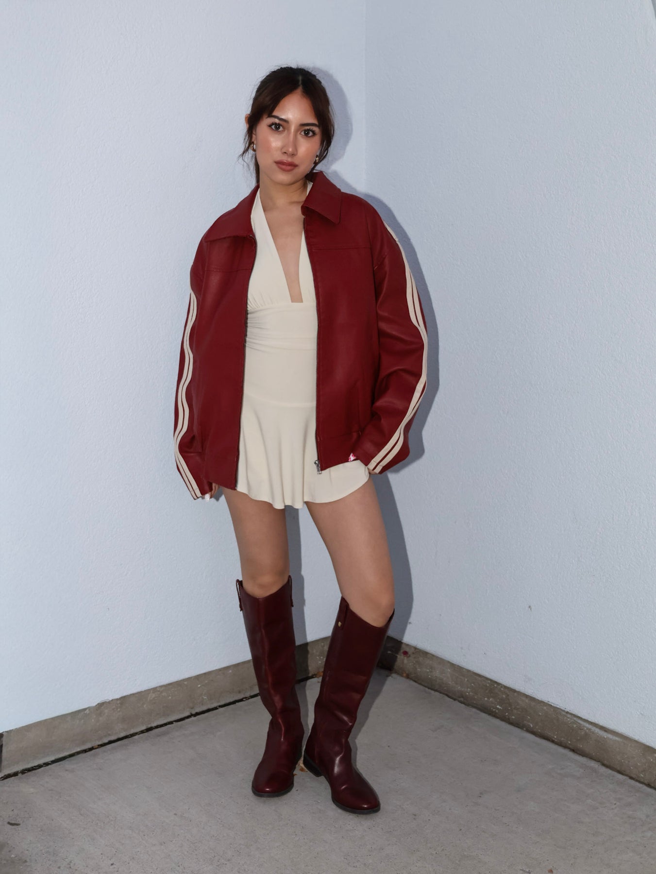 Person wearing a red jacket with white stripes, beige top, and brown knee-high boots against a light blue wall.